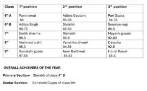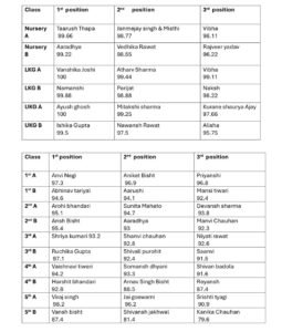 विद्यालय प्रशासन के अनुसार आज नर्सरी से कक्षा 9वीं तक का वार्षिक परीक्षा परिणाम घोषित किया गया, जिसका विवरण इस प्रकार है—